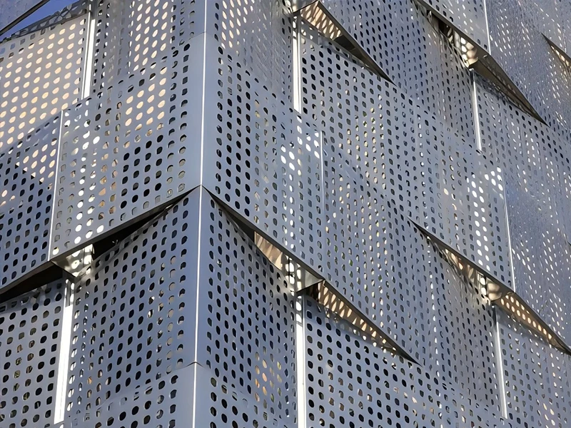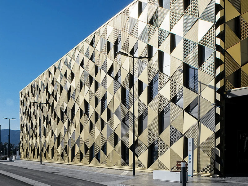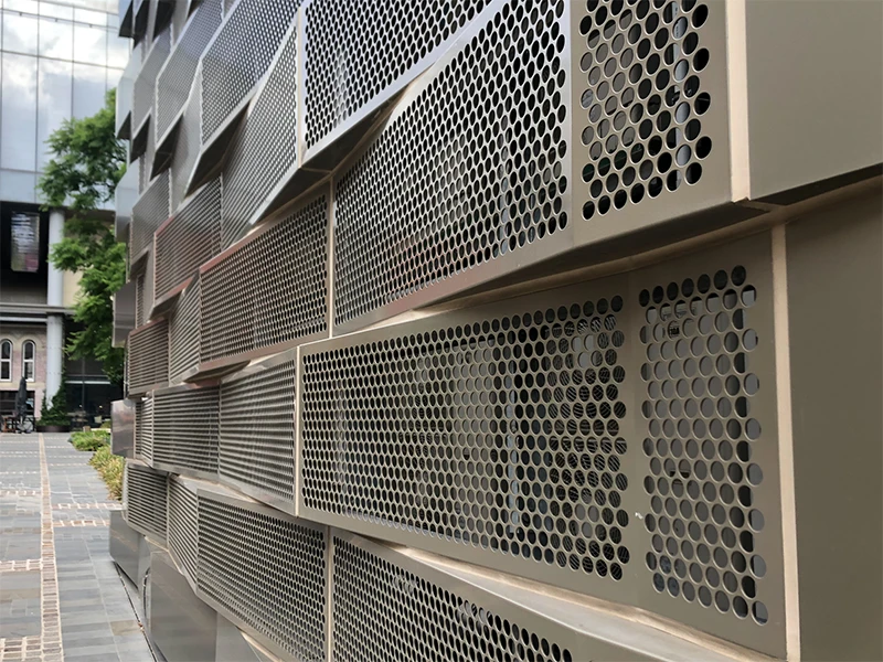 Tấm nhôm solid đục lỗ được sử dụng làm vật liệu trang trí cho mặt tiền các tòa nhà, không chỉ mang lại hiệu ứng thị giác độc đáo và cảm giác hiện đại mà còn có tác dụng chắn nắng và giảm nhiệt độ trong nhà hiệu quả nhờ thiết kế hoa văn lỗ khác nhau.