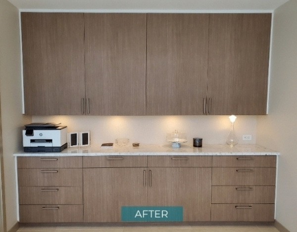 Ở các hệ tủ bếp, tủ quần áo, kệ tivi.. đây là khu vực thể hiện rõ nhất hiệu quả của phim dán. Phần cánh tủ, vốn là bề mặt tiếp xúc trực tiếp với người dùng, thường dễ bị trầy xước hoặc lỗi thời về màu sắc. Chỉ cần phủ một lớp film phù hợp, toàn bộ diện mạo của tủ có thể thay đổi hoàn toàn, từ vân gỗ hiện đại đến bề mặt giả đá hoặc kim loại. Không chỉ dừng lại ở lớp ngoài, phim còn có thể dán vào cả phần thùng tủ, đợt kệ hay hậu tủ, giúp không gian bên trong và bên ngoài đạt được sự đồng nhất, điều mà nhiều giải pháp cải tạo truyền thống khó thực hiện nếu không tháo dỡ.