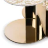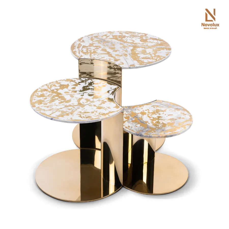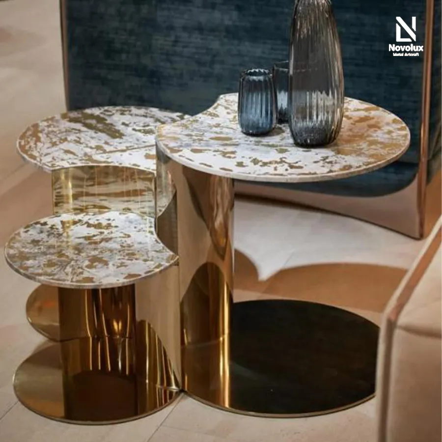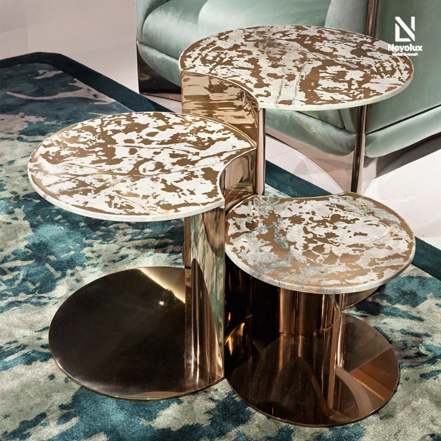 Bộ ba bàn với chiều cao khác nhau, sở hữu kết cấu thép không gỉ tinh xảo, kết hợp hài hòa giữa bề mặt lõm – lồi tạo chiều sâu hình khối. Mặt bàn đá cẩm thạch được vát cạnh và tạo hình tỉ mỉ, nhấn mạnh vẻ sang trọng và thủ công.