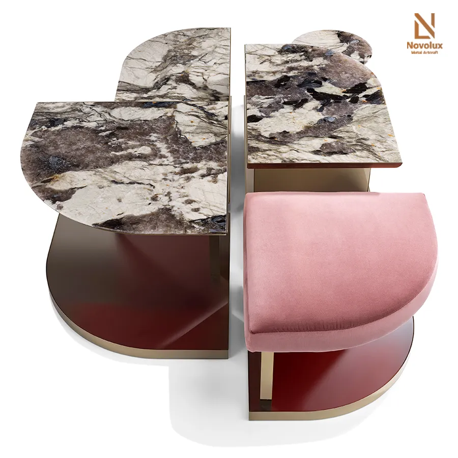 Bộ bàn thấp và ghế đôn sở hữu khung thép không gỉ hoàn thiện mờ mang đến sự linh hoạt trong bố cục không gian. Mặt bàn đá cẩm thạch được tạo hình với các cạnh bán nguyệt mềm mại, đặt trên hệ chân đế sơn mài phản chiếu, tạo hiệu ứng thị giác tinh tế và sang trọng.