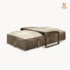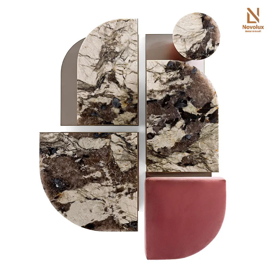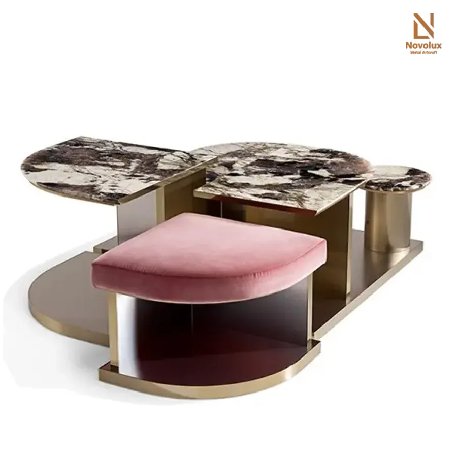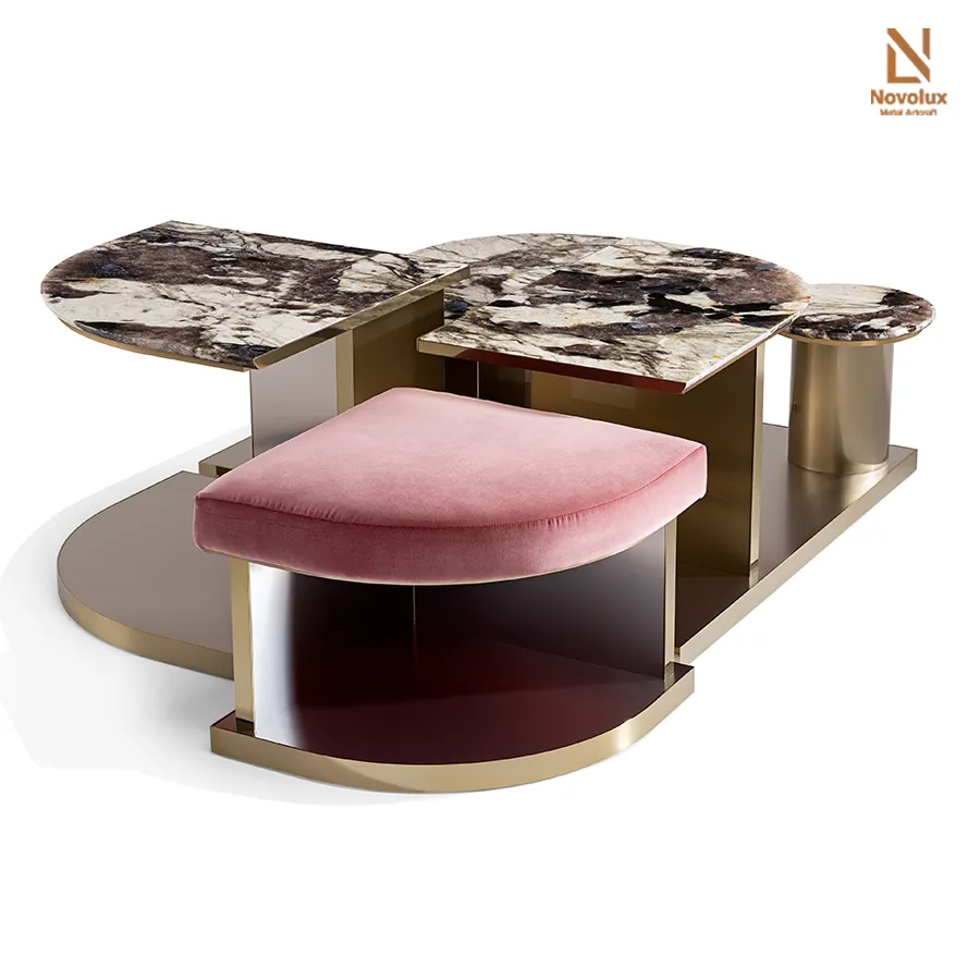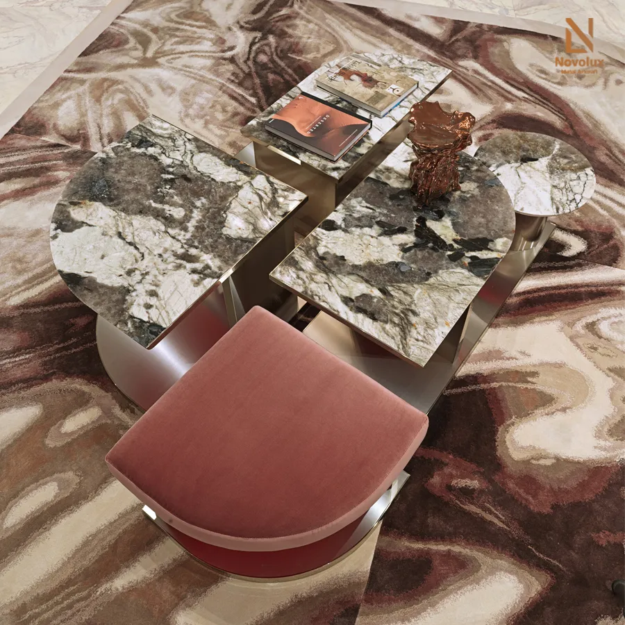 Bộ bàn thấp và ghế đôn sở hữu khung thép không gỉ hoàn thiện mờ mang đến sự linh hoạt trong bố cục không gian. Mặt bàn đá cẩm thạch được tạo hình với các cạnh bán nguyệt mềm mại, đặt trên hệ chân đế sơn mài phản chiếu, tạo hiệu ứng thị giác tinh tế và sang trọng.