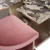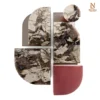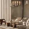 Các yếu tố thẳng đứng kết hợp cùng khung thép đánh bóng làm nổi bật ngôn ngữ thiết kế hình học hiện đại. Có thể tuỳ chỉnh lựa chọn về vật liệu kim loại và mặt đá cẩm thạch để phù hợp với từng phong cách nội thất.