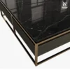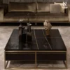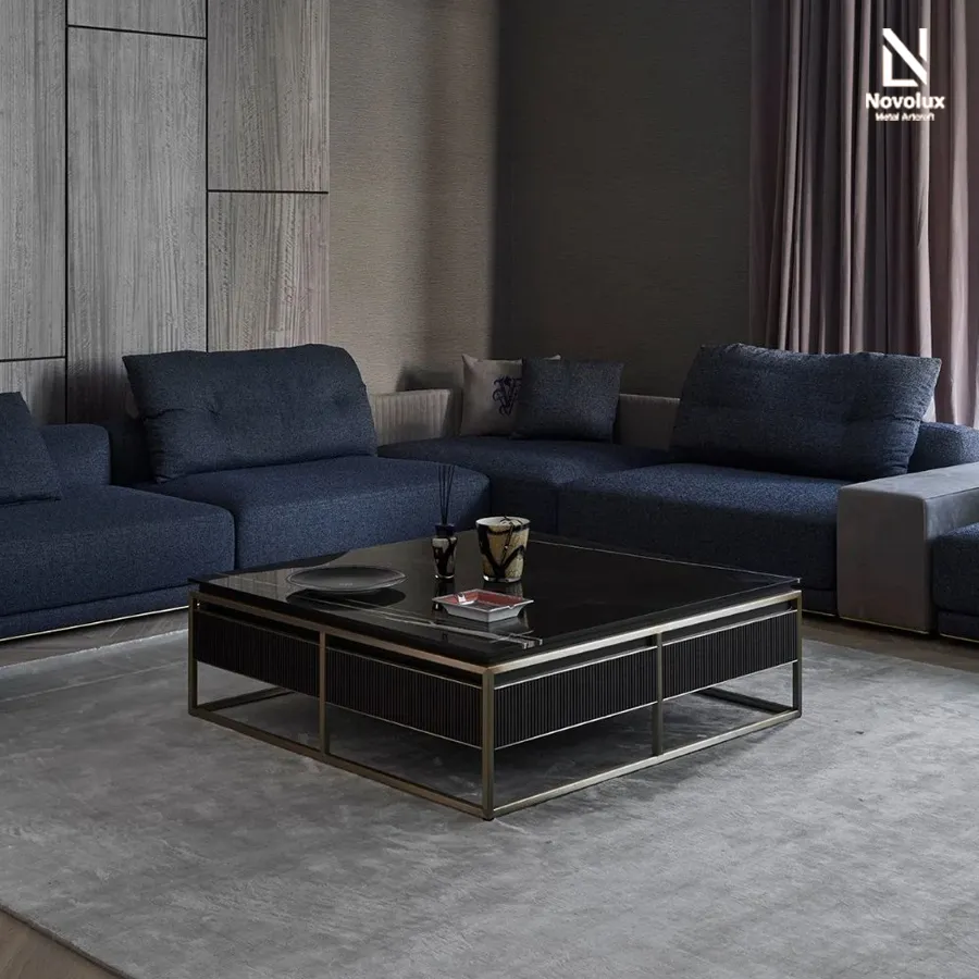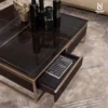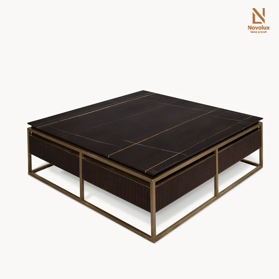 Bàn trà 4 ngăn kéo được chế tác từ gỗ tự nhiên, nổi bật với bề mặt chạm khắc nổi họa tiết sọc dọc tinh xảo, tạo chiều sâu và nhịp điệu thị giác sang trọng. Mặt bàn sử dụng đá cẩm thạch cao cấp, hoàn thiện với đường viền gia công âm tinh tế, vừa tăng tính thẩm mỹ vừa đảm bảo cảm giác gọn gàng, sắc nét. Khung bàn cùng các chi tiết trang trí bằng thép không gỉ mài bóng, mang lại điểm nhấn hiện đại và sự tương phản hài hòa với chất liệu gỗ.