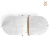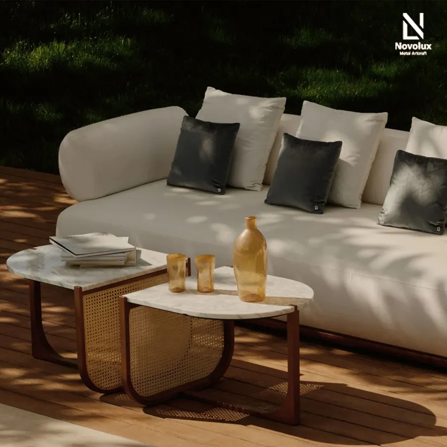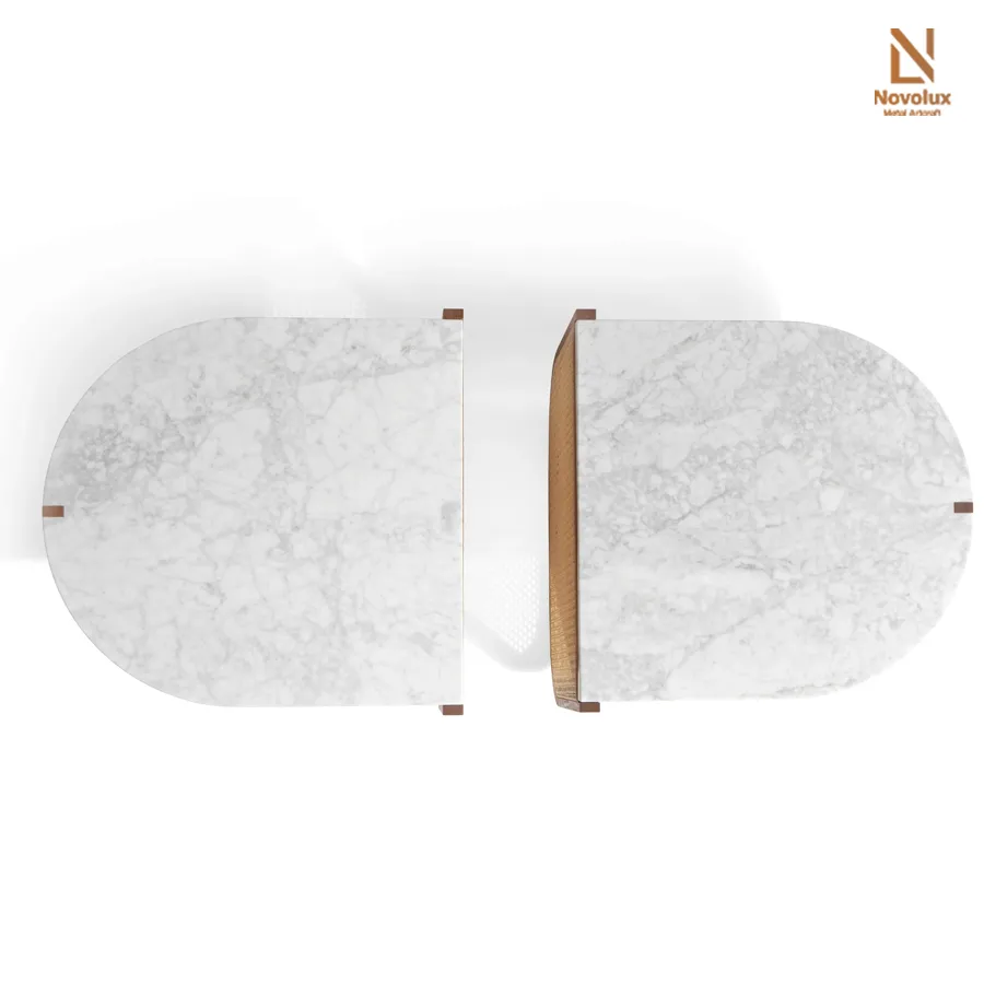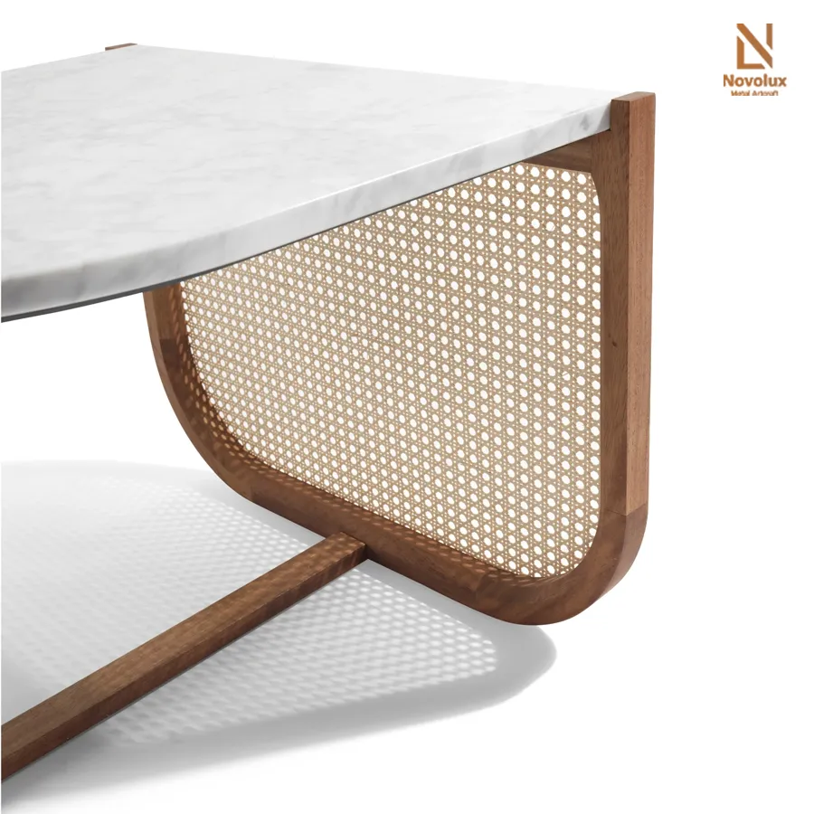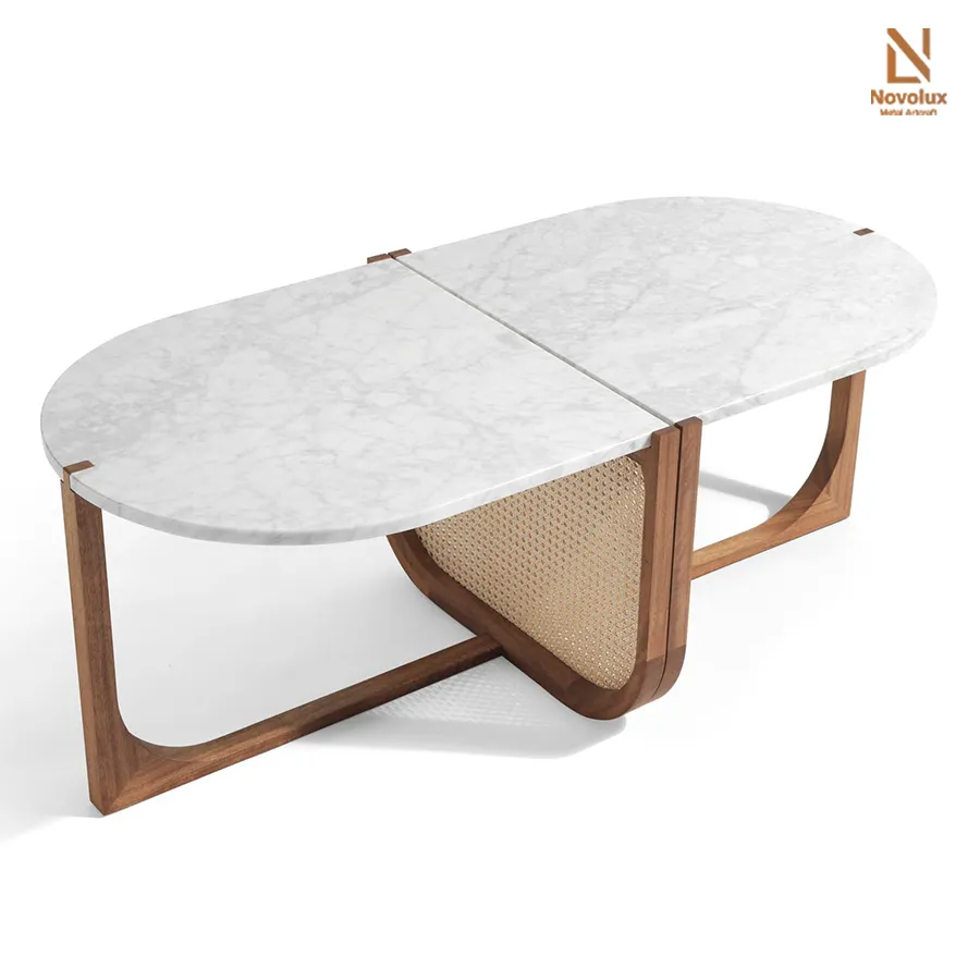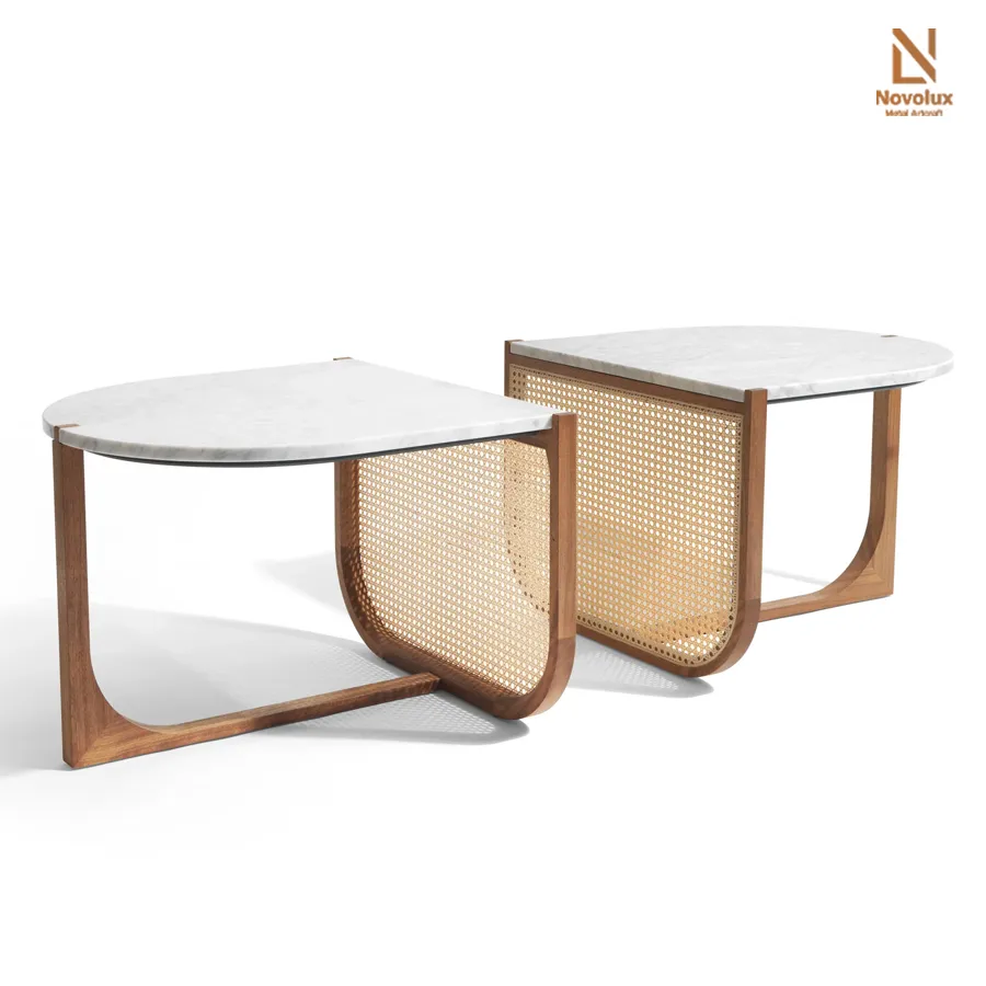 Bàn trà được thiết kế dưới dạng hai bàn nhỏ độc lập, mỗi bàn sở hữu mặt đá cẩm thạch Carrara mài bóng tinh tế, kết hợp khung chân bằng gỗ nguyên khối tạo hình bất đối xứng. Các chi tiết được trang trí bằng mây đan tự nhiên, mang lại cảm giác thủ công ấm áp và giàu tính nghệ thuật. Khi ghép đôi, hai chiếc bàn hòa quyện thành một bố cục tuyến tính hài hòa, tạo nên bề mặt đá cẩm thạch liền mạch, vừa ấn tượng về thị giác vừa linh hoạt trong cách bài trí không gian.