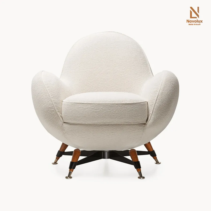 Ghế bành bọc vải co giãn, thiết kế ôm trọn đường nét cơ thể một cách tự nhiên, mang lại cảm giác thư giãn tối đa. Kết cấu bên trong từ gỗ nguyên khối và ván ép vững chắc, kết hợp hệ đệm polyurethane nhiều lớp phủ sợi acrylic, đảm bảo độ êm ái và đàn hồi bền bỉ. Chân đế năm cánh hình sao bằng thép đen, điểm xuyết chi tiết gỗ nguyên khối và đầu bọc đồng thau.