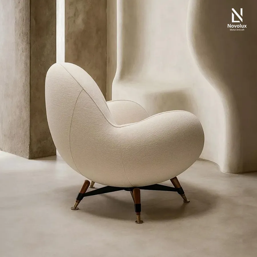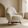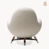 Ghế bành bọc vải co giãn, thiết kế ôm trọn đường nét cơ thể một cách tự nhiên, mang lại cảm giác thư giãn tối đa. Kết cấu bên trong từ gỗ nguyên khối và ván ép vững chắc, kết hợp hệ đệm polyurethane nhiều lớp phủ sợi acrylic, đảm bảo độ êm ái và đàn hồi bền bỉ. Chân đế năm cánh hình sao bằng thép đen, điểm xuyết chi tiết gỗ nguyên khối và đầu bọc đồng thau.