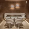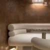 Thiết kế sofa gây ấn tượng với phần tựa lưng dạng trụ xếp lớp độc đáo, được bọc toàn bộ bằng vải co giãn cao cấp, mang lại hiệu ứng liền mạch và tinh tế cho tổng thể. Khung sofa kết hợp gỗ nguyên khối và gỗ nhiều lớp chắc chắn, bên dưới là hệ thống webbing đàn hồi giúp nâng đỡ tối ưu, tăng độ êm ái khi sử dụng và đảm bảo độ bền lâu dài theo thời gian.