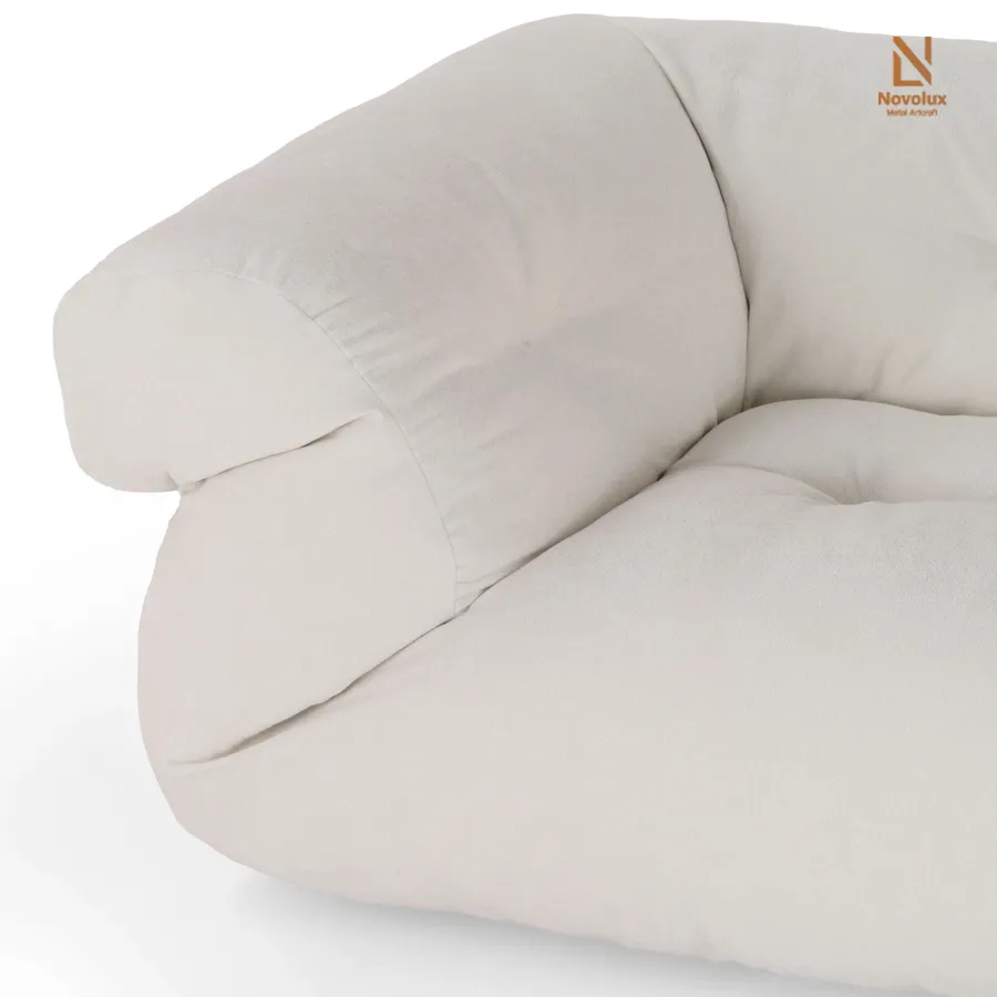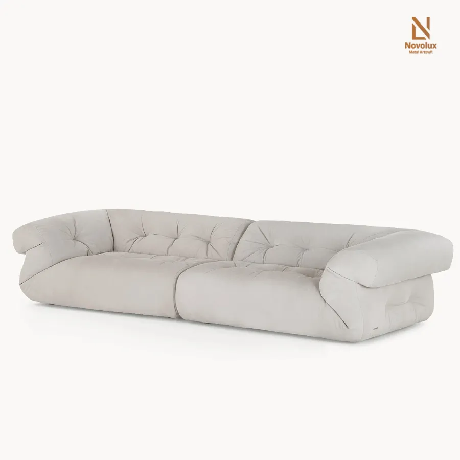 Sofa được bọc da hoặc vải cao cấp, kết hợp lớp chăn lông ngỗng dày, cố định vào khung gỗ nhiều lớp chắc chắn bằng hệ thống dây đai căng. Phần ghế ngồi sử dụng dây đai đàn hồi nâng đỡ, với đệm polyurethane và Memory Foam bọc trong lớp chăn lông ngỗng nhiều ngăn, mang lại cảm giác êm ái vượt trội. Tay vịn và tựa lưng kéo dài, chần dây đai tạo hiệu ứng “chăn bông” bồng bềnh, tối đa hóa sự mềm mại và thoải mái khi sử dụng.