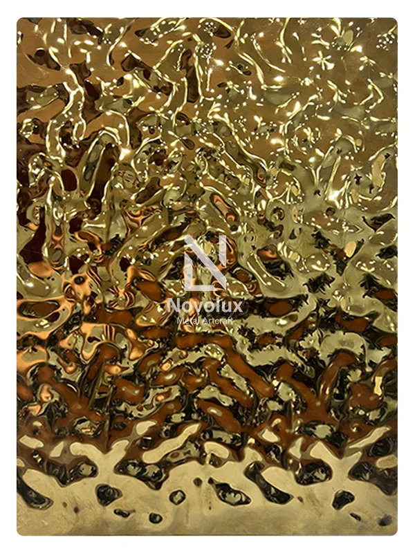 Bề mặt của tấm inox vân sóng nước có các hoa văn sóng độc đáo, giống như những gợn sóng trên mặt nước. Nhờ khả năng phản xạ ánh sáng linh hoạt, vật liệu này không chỉ nâng cao giá trị thẩm mỹ mà còn tạo chiều sâu không gian và điểm nhấn thị giác ấn tượng cho công trình.