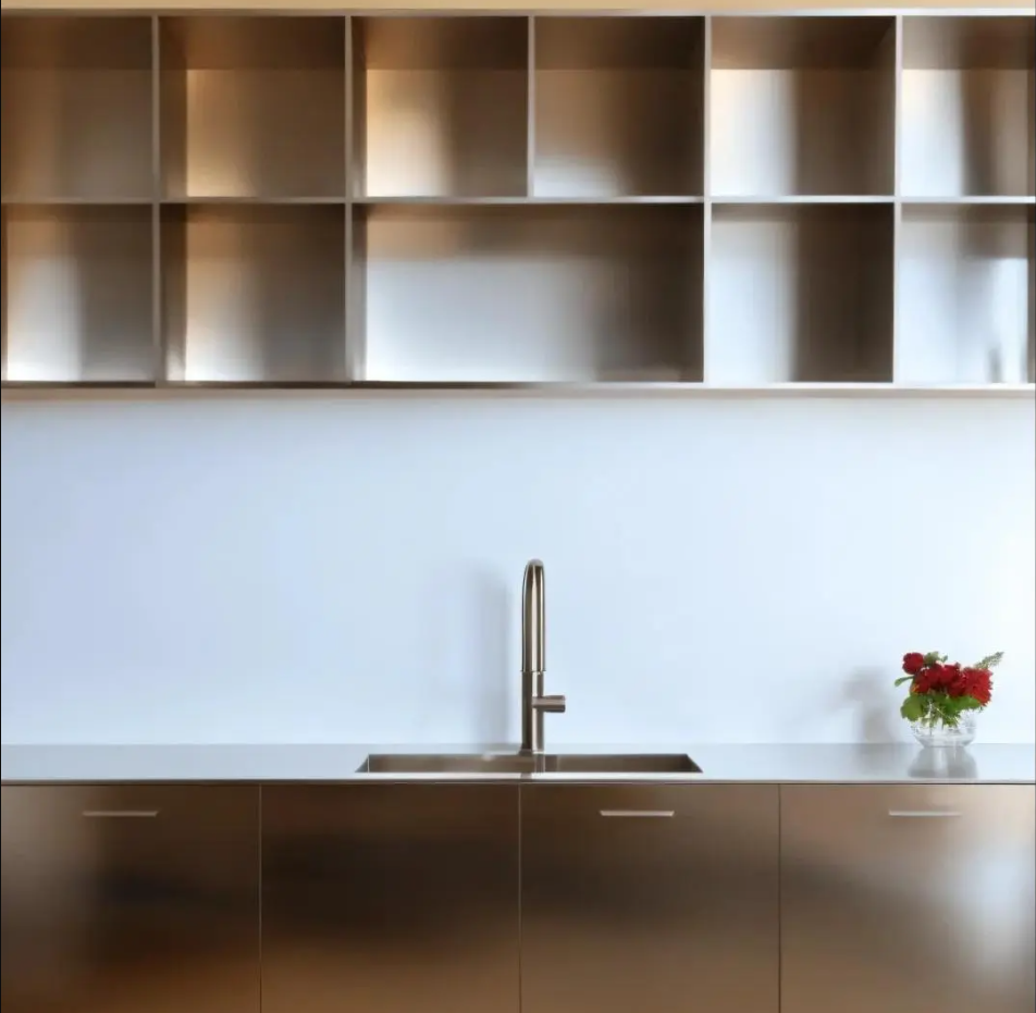 Tủ bếp bằng thép không gỉ này có đường nét sạch sẽ và mịn màng theo phong cách hiện đại. Ánh kim loại độc đáo thể hiện kết cấu thời trang, mang đến vẻ đẹp tinh tế cho không gian.