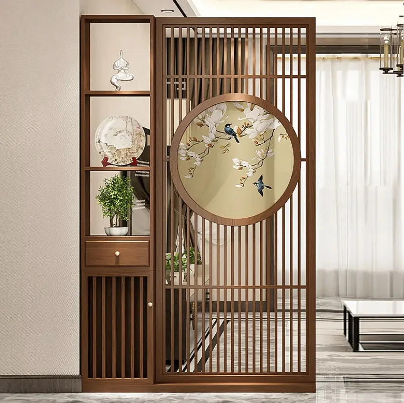 Thiết kế nổi bật với họa tiết hoa mai cắt bằng laser trong khung tròn – một biểu tượng cổ điển của văn hóa Trung Hoa, tượng trưng cho sự kiên cường và duyên dáng. Xung quanh họa tiết là các thanh dọc được sắp xếp đều đặn, tạo nên cấu trúc và sự cân bằng, mang lại cảm giác mở rộng không gian nhưng vẫn đảm bảo sự phân tách thị giác tinh tế.